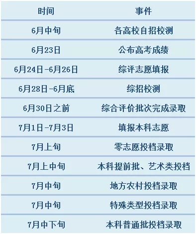 根据往年来看,6月10日到6月20日左右是各高校组织自主招生笔试与面试的时间,以及特殊类型院校(如军校、公安学院、南科大等)组织院校测试的时间,参加的考生请提前看好测试时间与地点哦。 6月23日 公布高考成绩